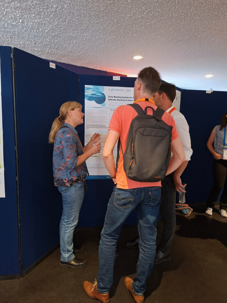 Adviseur Waterkwaliteit Sandra Strating gaf een posterpresentatie over het onderzoek naar de toepassing van online flowcytometrie als early warning-systeem voor de detectie van fecale bacteriën in duinwinningen. Sandra: “Deze bacteriën zitten in ontlasting. Ze zijn niet ziekteverwekkend, maar kunnen een indicator zijn voor mogelijk wél ziekmakende soorten.” Normaal gesproken worden deze metingen uitgevoerd via kweek. Het duurt dan een tot twee dagen voordat er een resultaat is. Online flowcytometrie maakt het mogelijk om elk uur een watermonster te nemen en het totale aantal cellen te meten. Het meetresultaat is direct zichtbaar. Sandra: “Een plotselinge verandering in het aantal of soorten cellen kan een aanwijzing zijn dat er iets misgaat in de bron. Op dat moment neem je watermonsters om te kijken of er ook gevaarlijke bacteriën aanwezig zijn.”