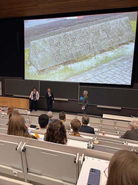 Vier PhD’s gaven een flash-presentatie over hun promotieonderzoek. Sanne: “Een van hen vertelde hoe je met wolken meer licht kunt creëren om de aarde af te koelen. Heel inspirerend.” Hoogleraar Annemiek ter Heijne (WUR) ging in op haar onderzoek om waardevolle componenten uit afvalstromen terug te winnen. Barbara Joziasse, collegelid van de Algemene Rekenkamer, was de laatste spreker. Sanne: “Zij gaf aan dat voor alle plannen van de watersector ook financiering nodig is. En ze riep op om samen te werken aan betaalbaar drinkwater voor nu en de generaties na ons.”