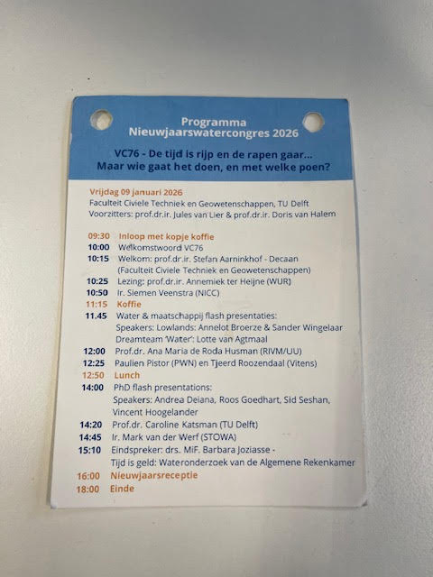 Al tientallen jaren organiseert de TU Delft in januari het Nieuwjaars Watercongres voor de Nederlandse watersector. In de editie van 2026 stonden samenwerking en financiering van de wateropgave centraal. Vier collega’s vertegenwoordigden Het Waterlaboratorium.